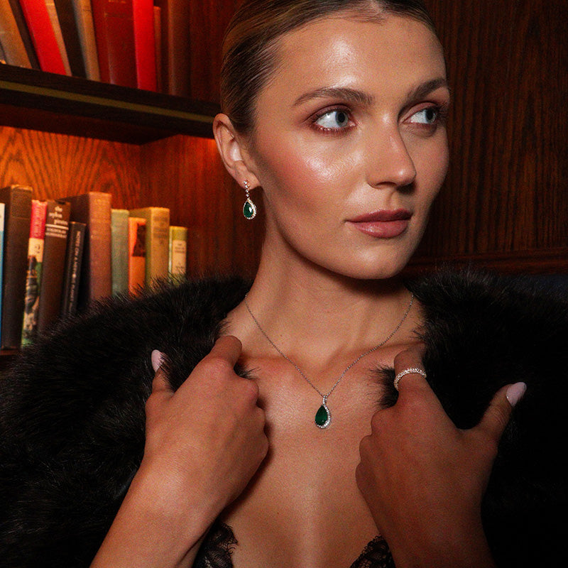 Pear Emerald & Diamond Cluster Drop Earringsnatural