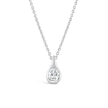 Crafted in 9ct white gold, this elegant pendant showcases a pear cut diamond delicately cradled in a smooth bezel setting.