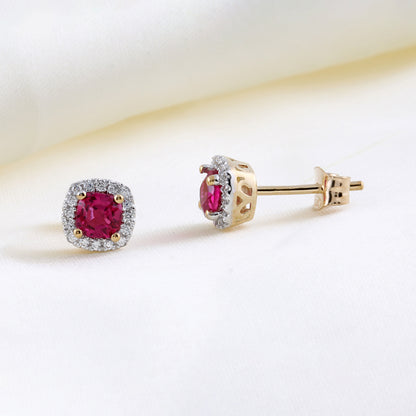 9ct yellow gold earring with a cushion cut ruby red cubic zirconia centre stone surrounded by a halo of white cubic zirconia.