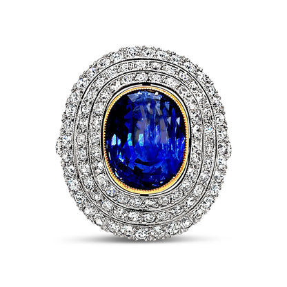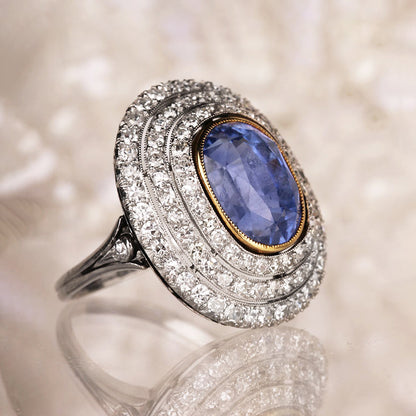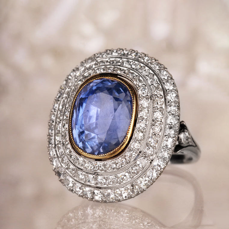 This breathtaking antique ring features a 10ct oval cut Ceylon sapphire in a rubover setting, encircled by three intricate rows of round brilliant cut diamonds in a halo style. Crafted in a combination of 18ct gold and platinum, the ring exudes timeless elegance and exceptional craftsmanship.