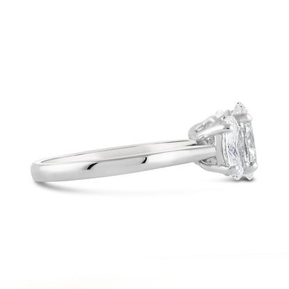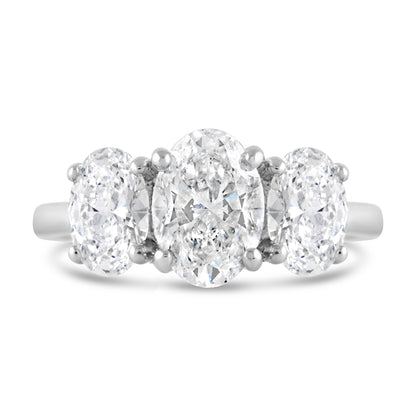 At its heart lies a dazzling 1.29ct oval cut diamond, flanked by two perfectly matched oval side stones to enhance it's sparkle.