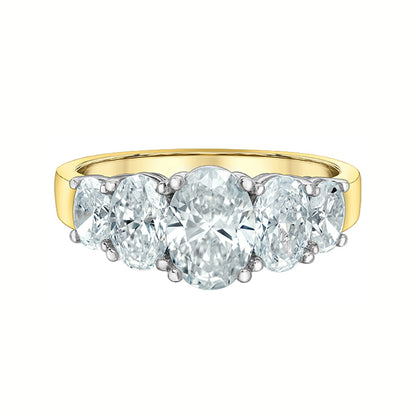 This striking eternity ring is crafted in 18ct yellow gold and showcases a seamless row of five oval cut laboratory grown diamonds, radiating from every angle.