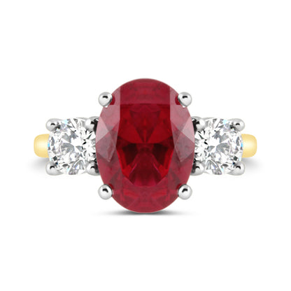 This exquisite three stone ring features a vibrant 3.65ct oval cut laboratory grown Ruby gemstone in a classic four claw setting, flanked by two round brilliant laboratory grown diamonds