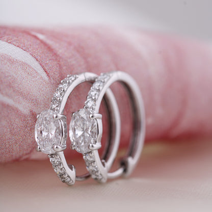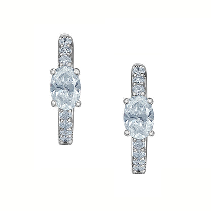 These 9ct white gold diamond hoop earrings feature a striking oval cut diamond at the center, elegantly framed by a row of pavé set round brilliant diamonds along the front of the hoop.