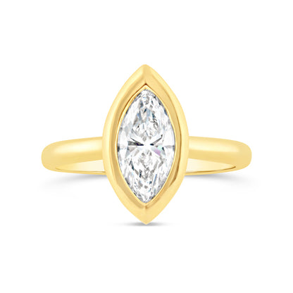 A bold twist on timeless elegance. This stunning solitaire features a sleek laboratory grown marquise cut diamond, bezel set in radiant 18ct yellow for a modern yet enduring silhouette.