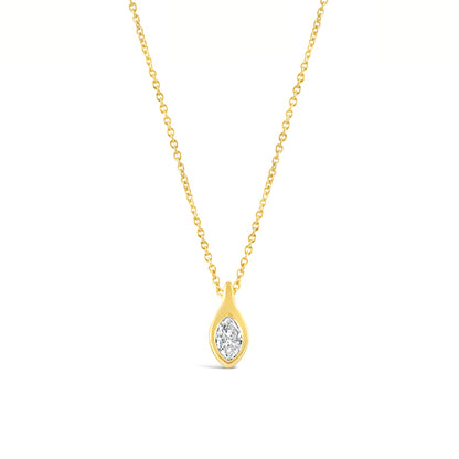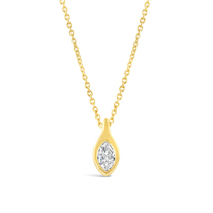 Crafted in 9ct yellow gold, this elegant pendant showcases a marquise cut diamond delicately cradled in a smooth bezel setting.