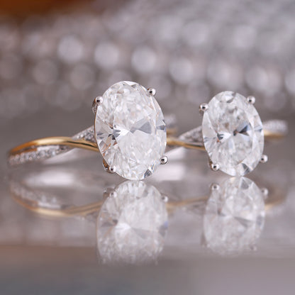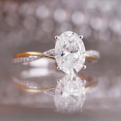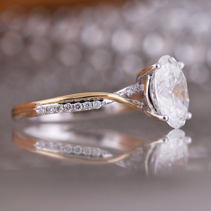 This stunning engagement ring features an oval-cut diamond as its centerpiece, held securely by four claws to showcase its brilliance. The band is crafted with a delicate twist design, blending 18ct white and yellow gold for a modern, elegant contrast. Small round diamonds accentuate the white gold portion of the band, adding a touch of sparkle and enhancing the look.The laboratory-grown center diamond is truly a showstopper, creating a perfect harmony of metals, style, and sparkle in this stunning ring.