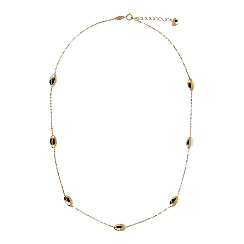 9ct yellow gold necklace featuring seven polished gold discs, elegantly stationed at equal intervals along a fine gold chain.