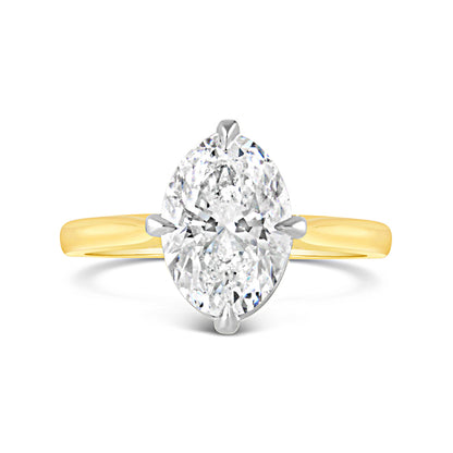 At its heart lies a 2.50ct D colour Oval cut laboratory grown diamond, loved for its exceptional brilliance and rare white hue. The warmth of the yellow gold contrasts beautifully with the clarity of the diamond, creating a striking visual balance.