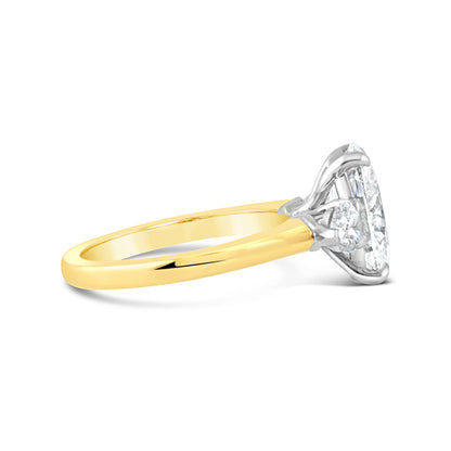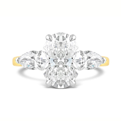 This exquisite three-stone ring features a stunning oval center diamond, beautifully complemented by two pear-cut side diamonds, all crafted with ethically sourced Laboratory Grown Diamonds. Set in sleek 18ct yellow and white gold, this timeless design radiates elegance, making it a perfect symbol of love and commitment.