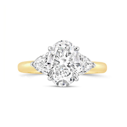 Crafted in 18ct yellow gold, this elegant engagement ring features a stunning 2.59ct Oval cut Laboratory Grown diamond at its center, flanked by two eye catching Trillion cut diamonds.