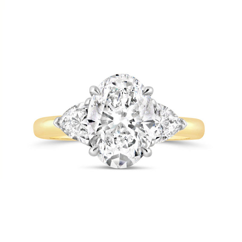 Crafted in 18ct yellow gold, this elegant engagement ring features a stunning 3.07ct Oval cut Laboratory Grown diamond at its center, flanked by two eye catching Trillion cut diamonds.