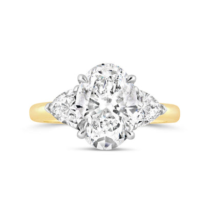 Crafted in 18ct yellow gold, this elegant engagement ring features a stunning 3.51ct Oval cut Laboratory Grown diamond at its center, flanked by two eye catching Trillion cut diamonds.