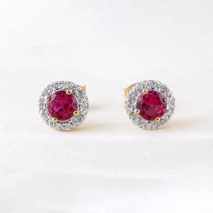 9ct yellow gold earrings with a round ruby red cubic zirconia centre stone surrounded by a halo of white cubic zirconia.